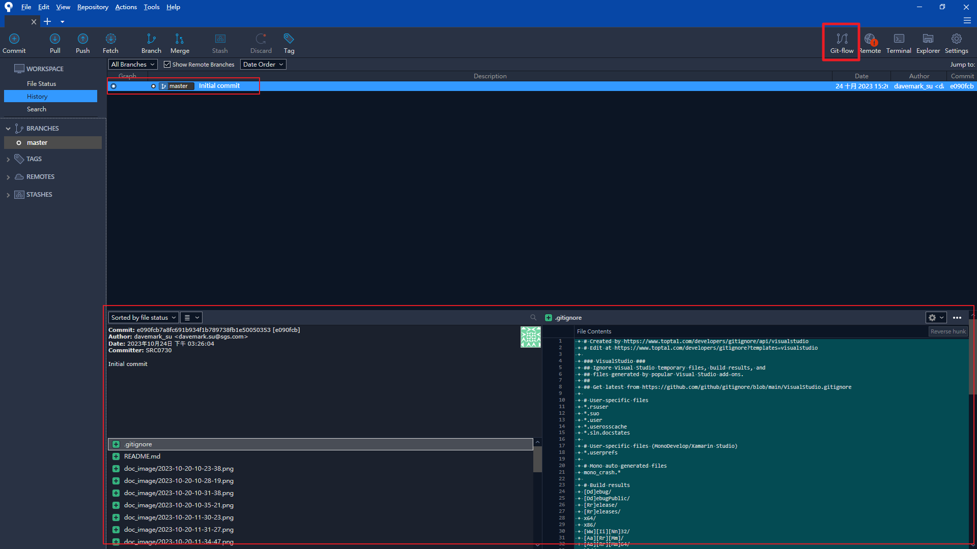 BRANCHS底下master分支,我們會看到剛剛增加的 commit,並點擊該項目可於下方查看異動項目清單。這時我們點擊右上角Git-flow按鈕設定未來上版規則。 -