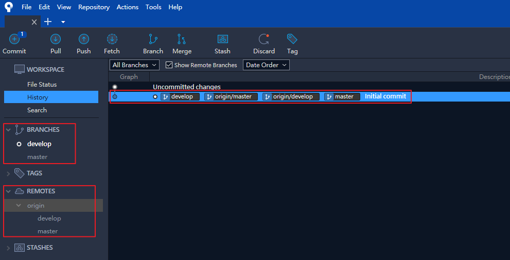 BRANCHES有兩個分別為 develop 及 master,但REMOTES的 origin 並無任何 Branch,我們接著按 Push 至 Remote。 -